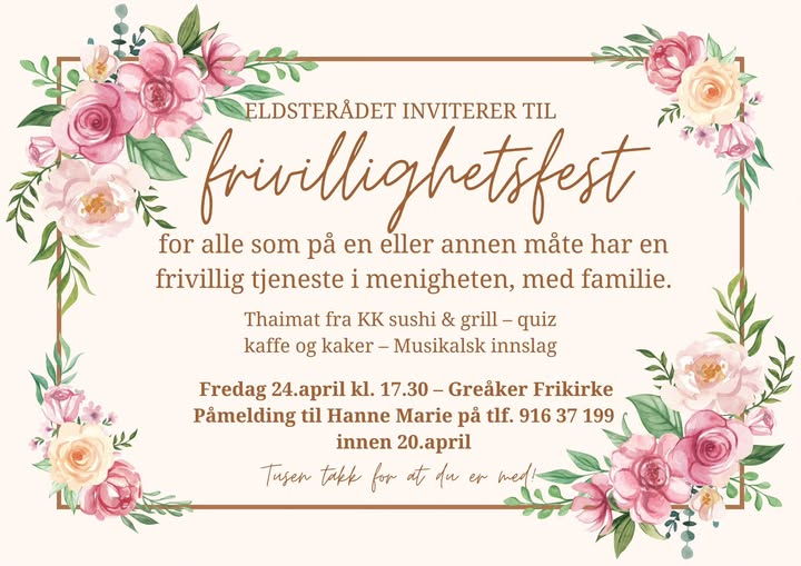 Frivillighetsfest fredag 24. april 2026 17:30 21:00 Greåker Frikirke 2 Klevaveien Greåker, Viken, 1719 Norway (kart) Google Calendar ICS